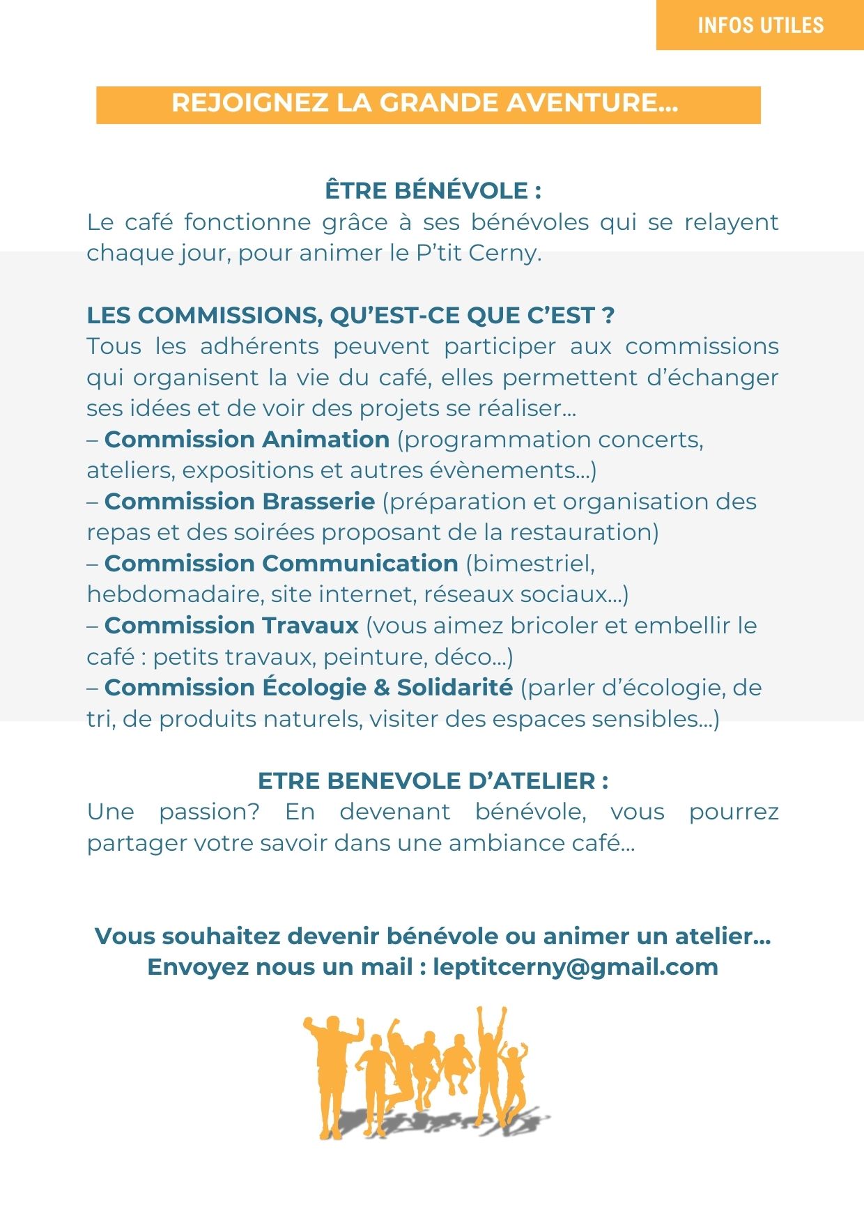 Nous recherchons de nouveaux bénévoles occasionnels : n’hésitez pas à nous envoyer un mail à coordination.leptitcerny@gmail.com