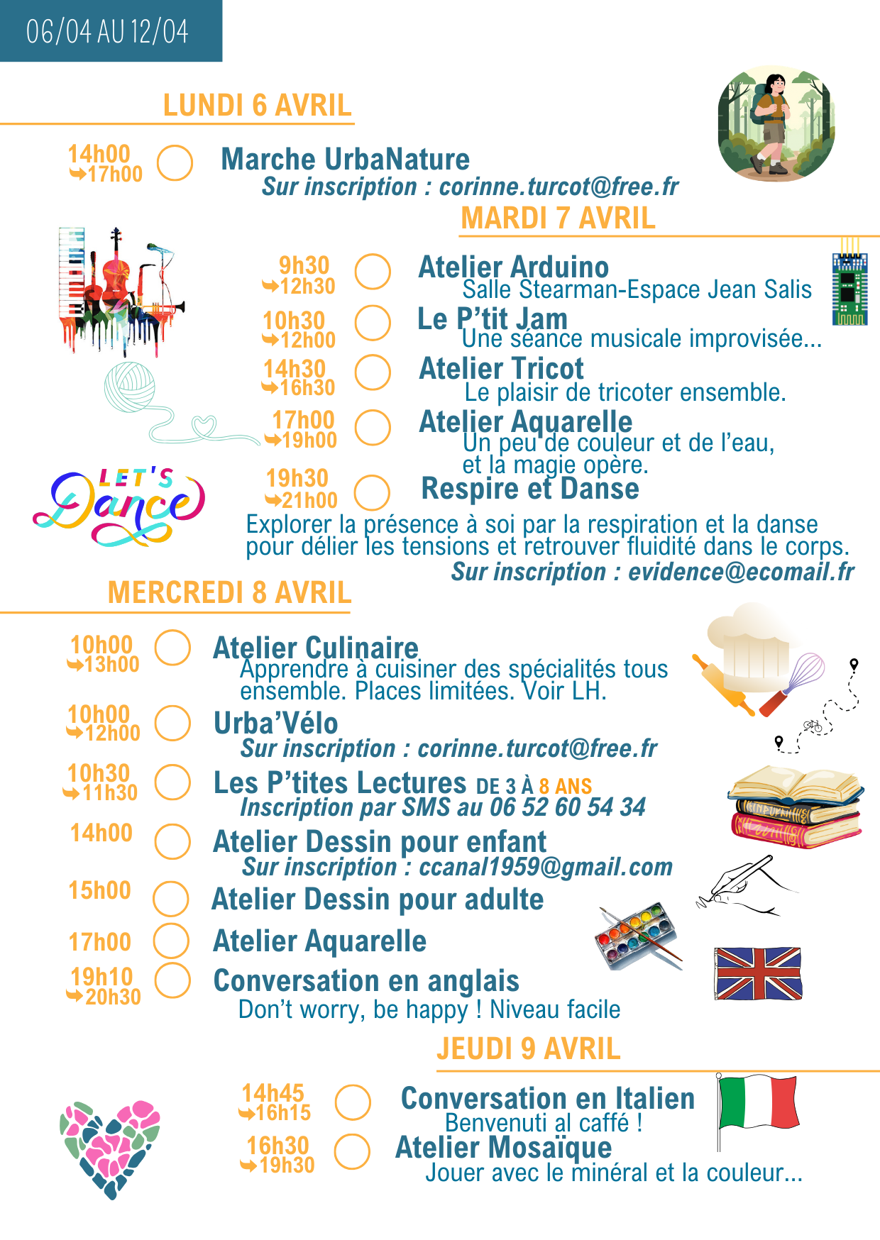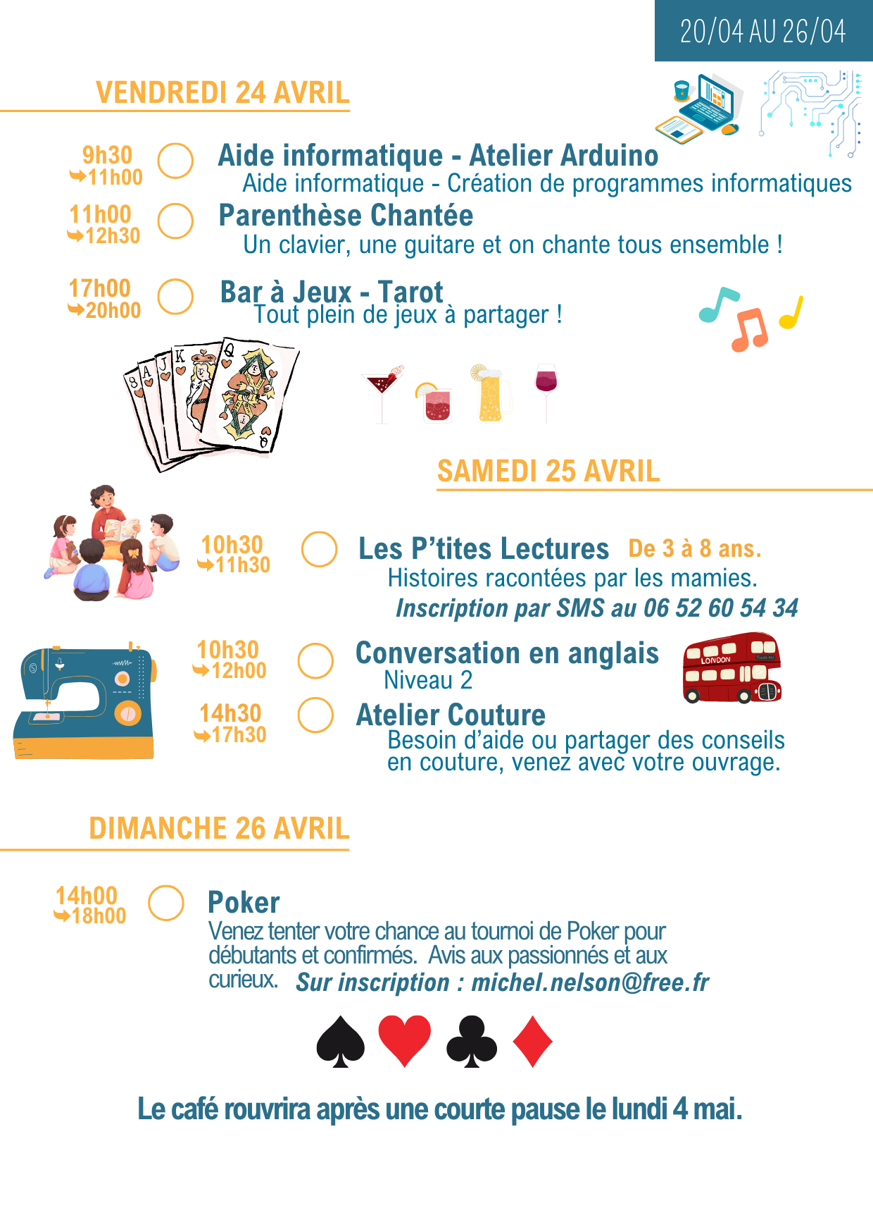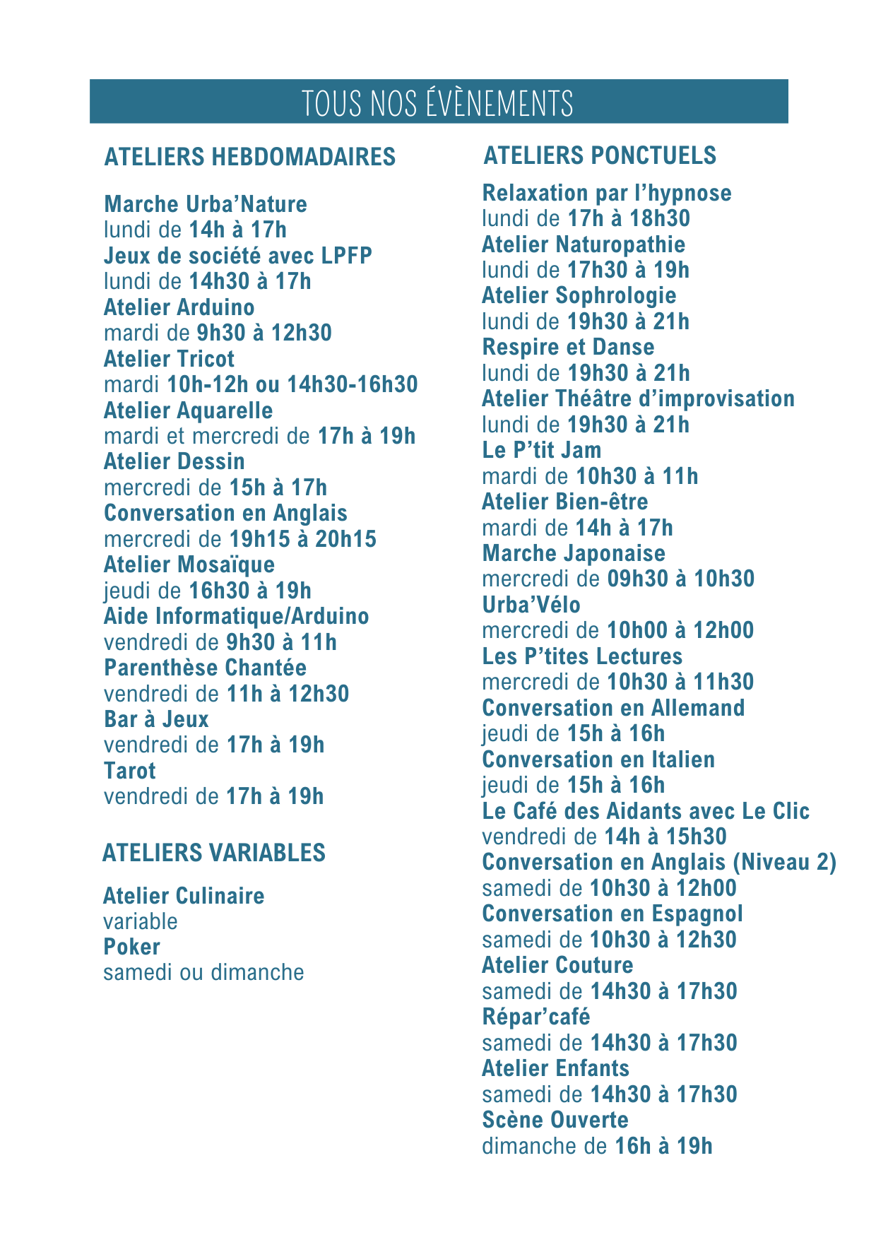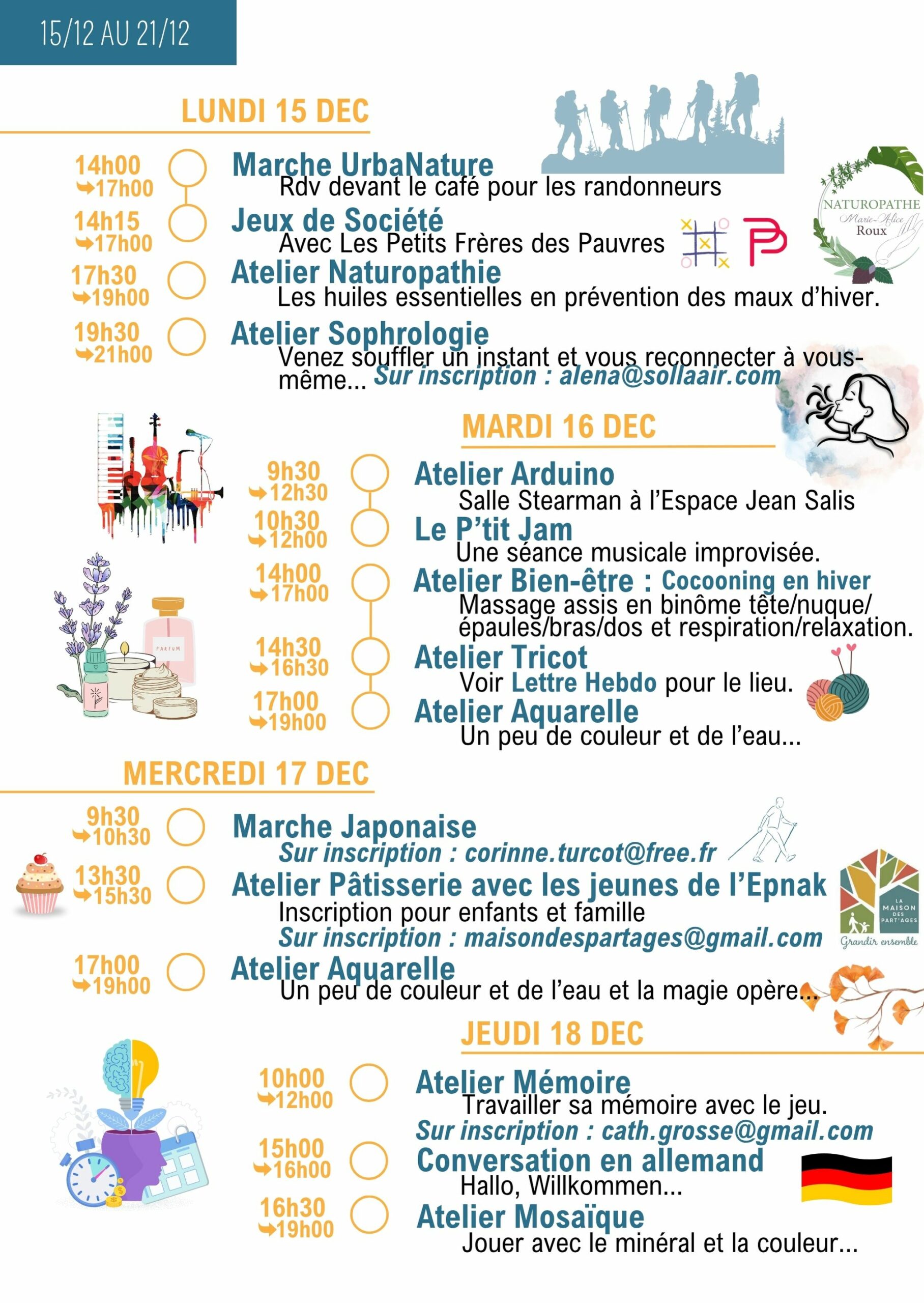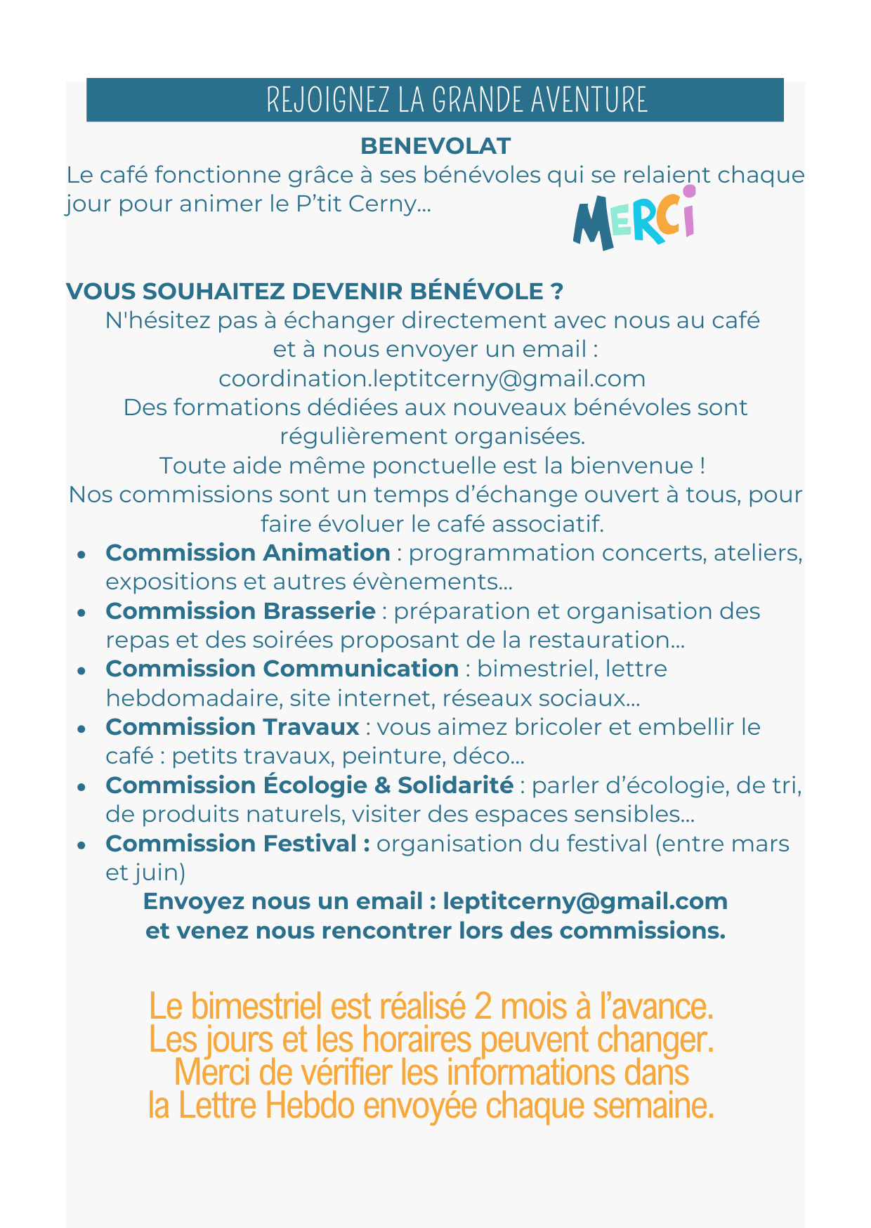 Merci de vérifier les informations dans la lettre hebdo, les jours et les horaires peuvent changer…