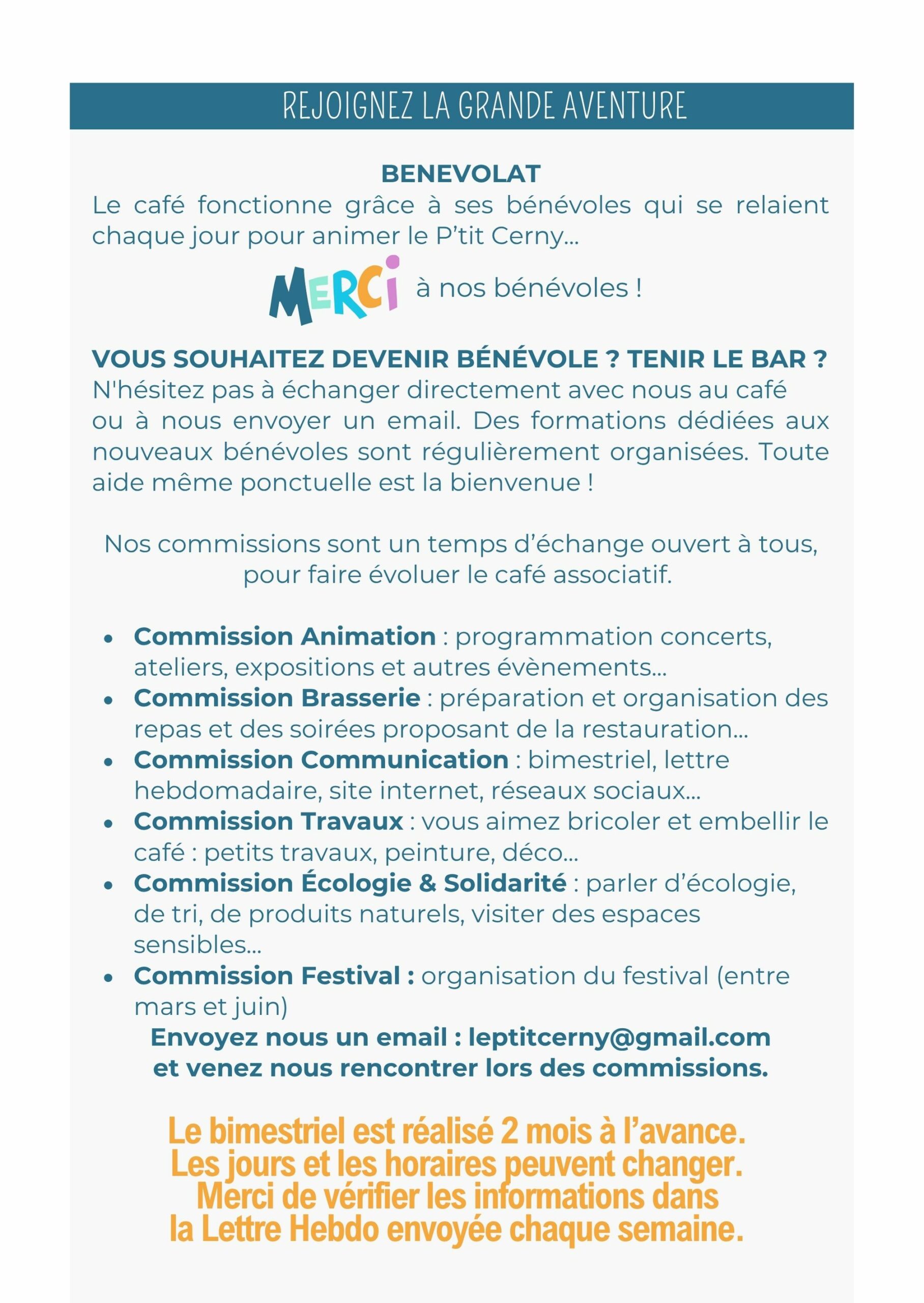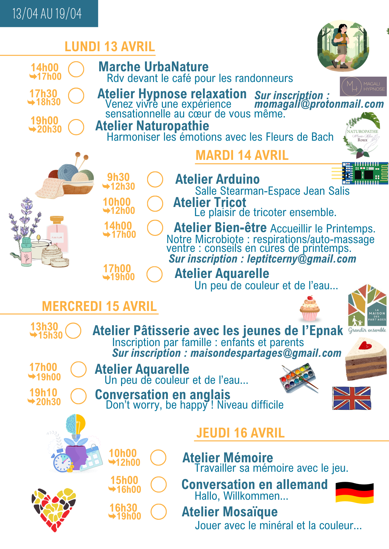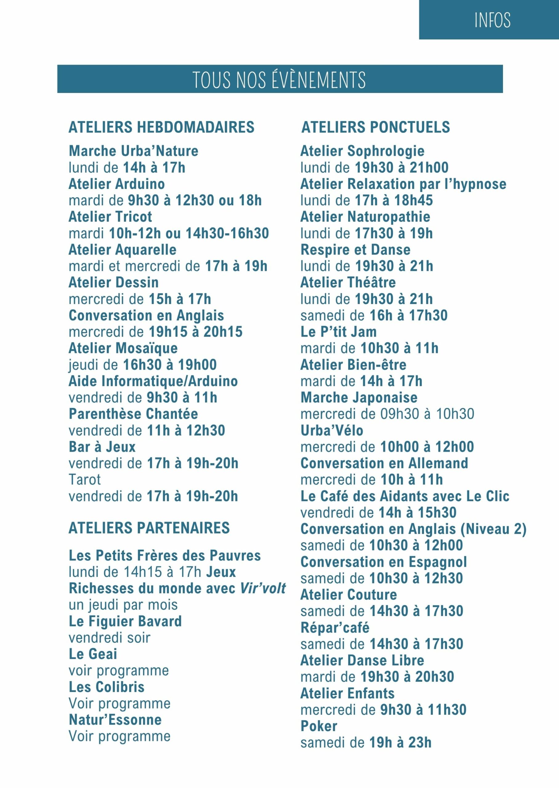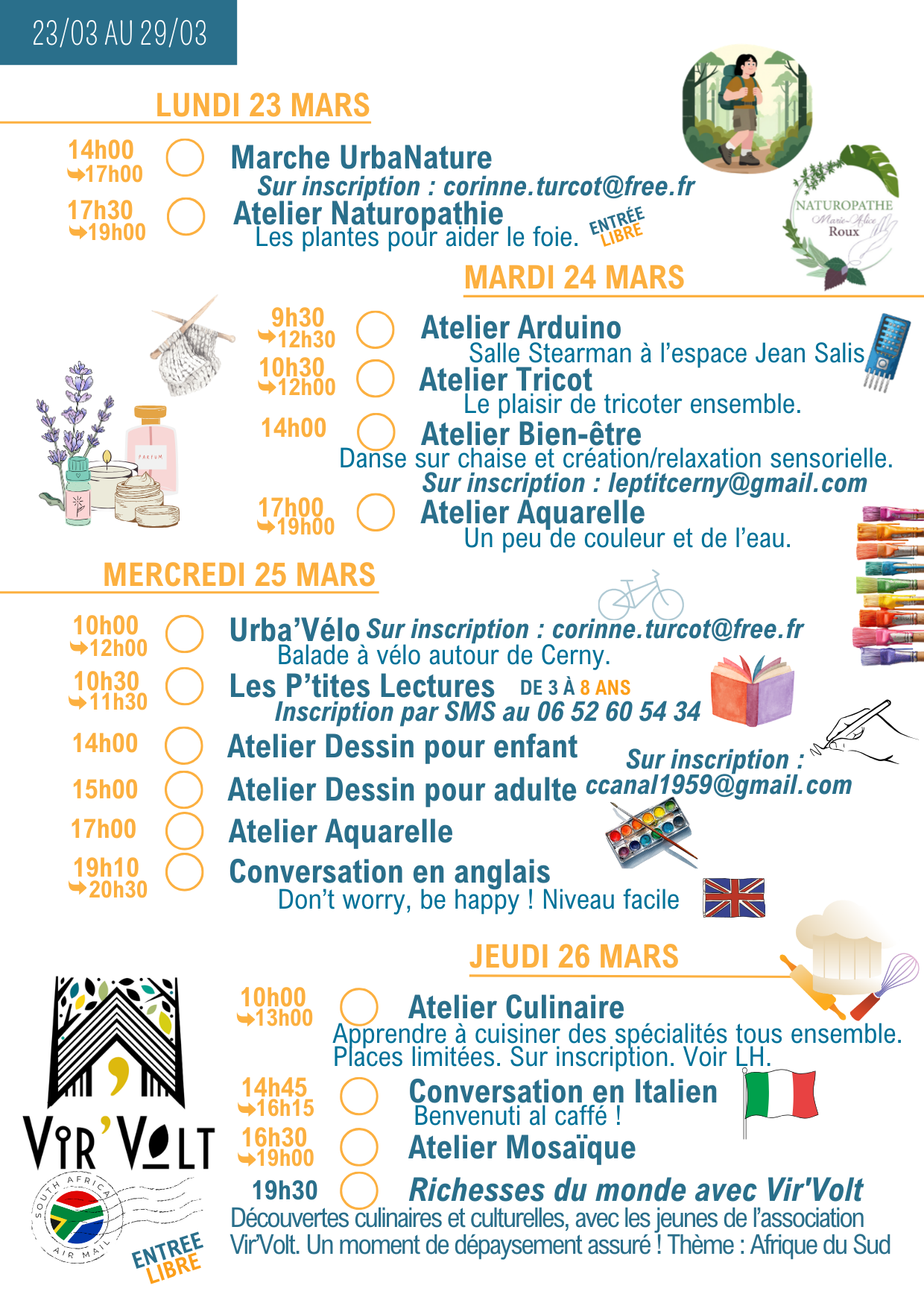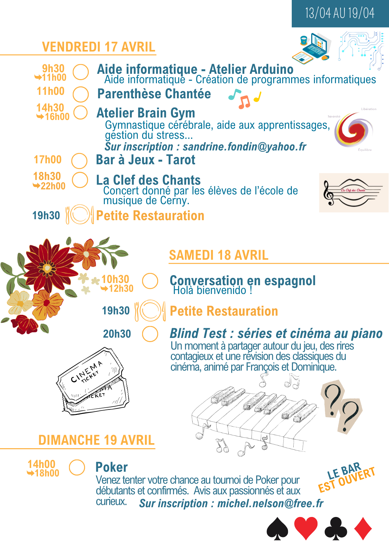 Merci de vérifier les informations dans la lettre hebdo, les jours et les horaires peuvent changer…