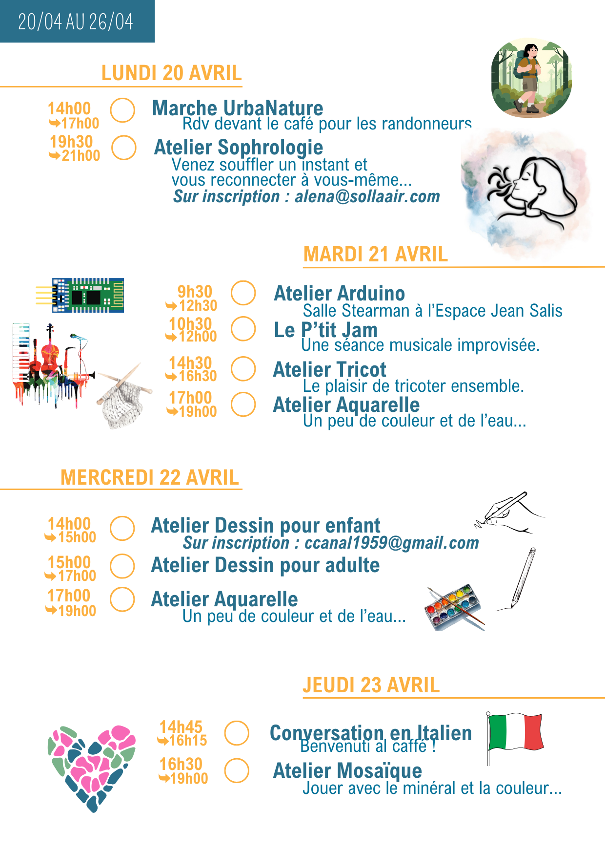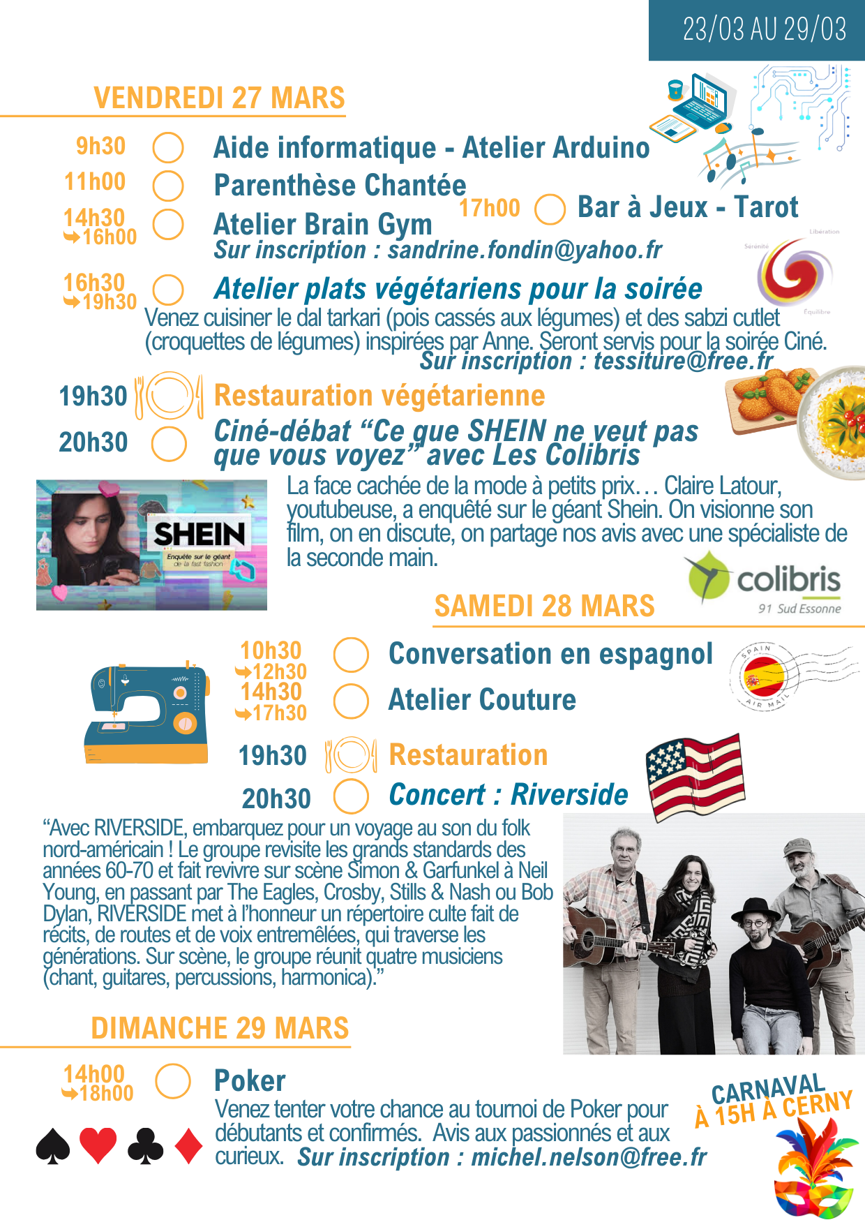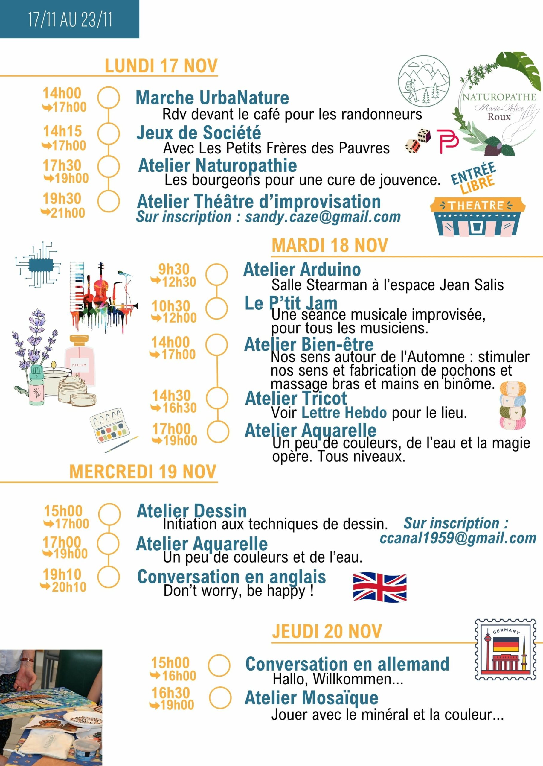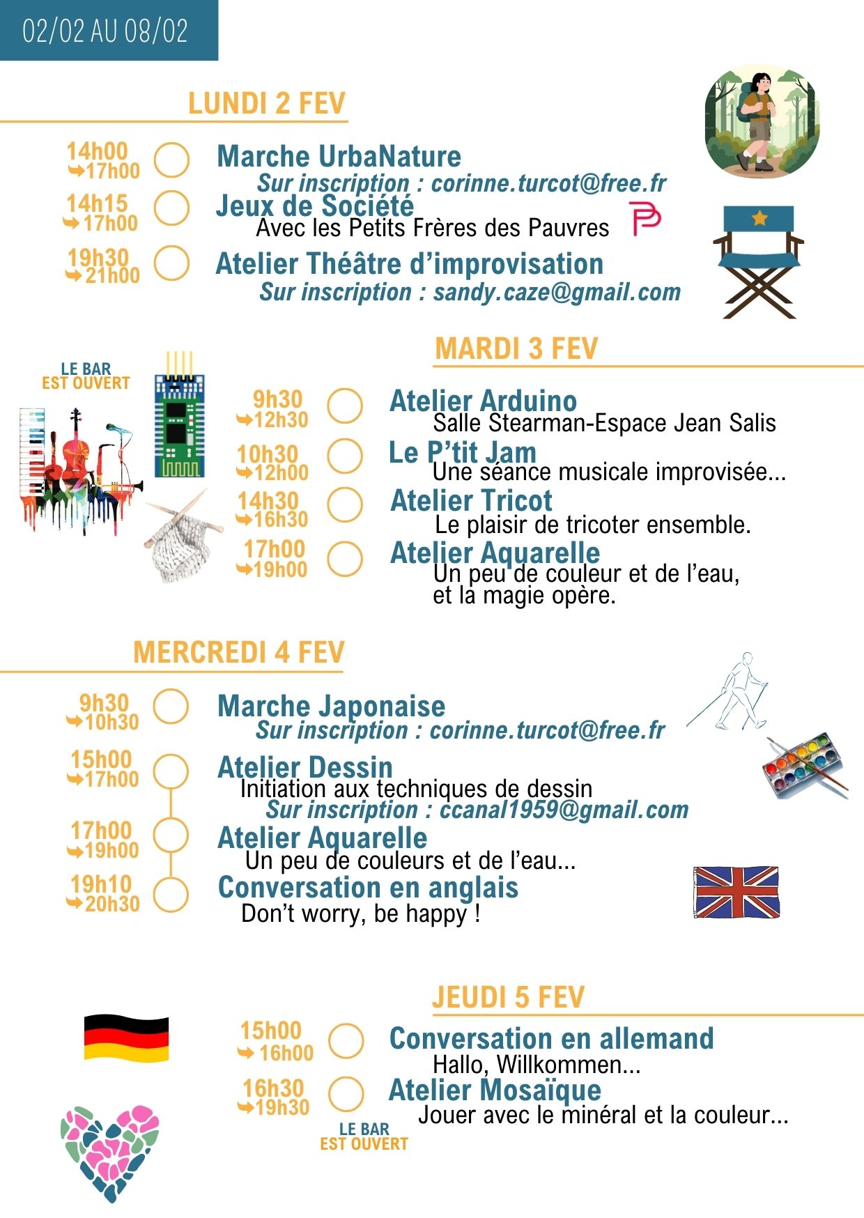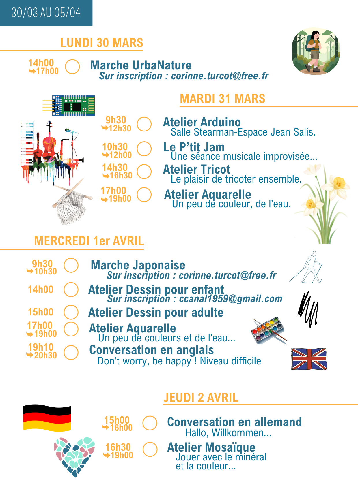 Merci de vérifier les informations dans la lettre hebdo, les jours et les horaires peuvent changer…