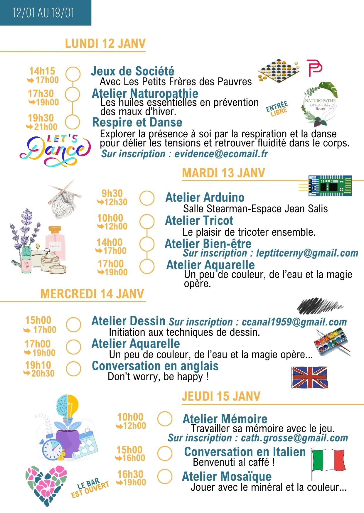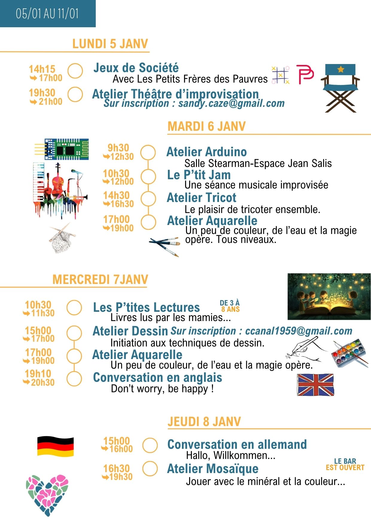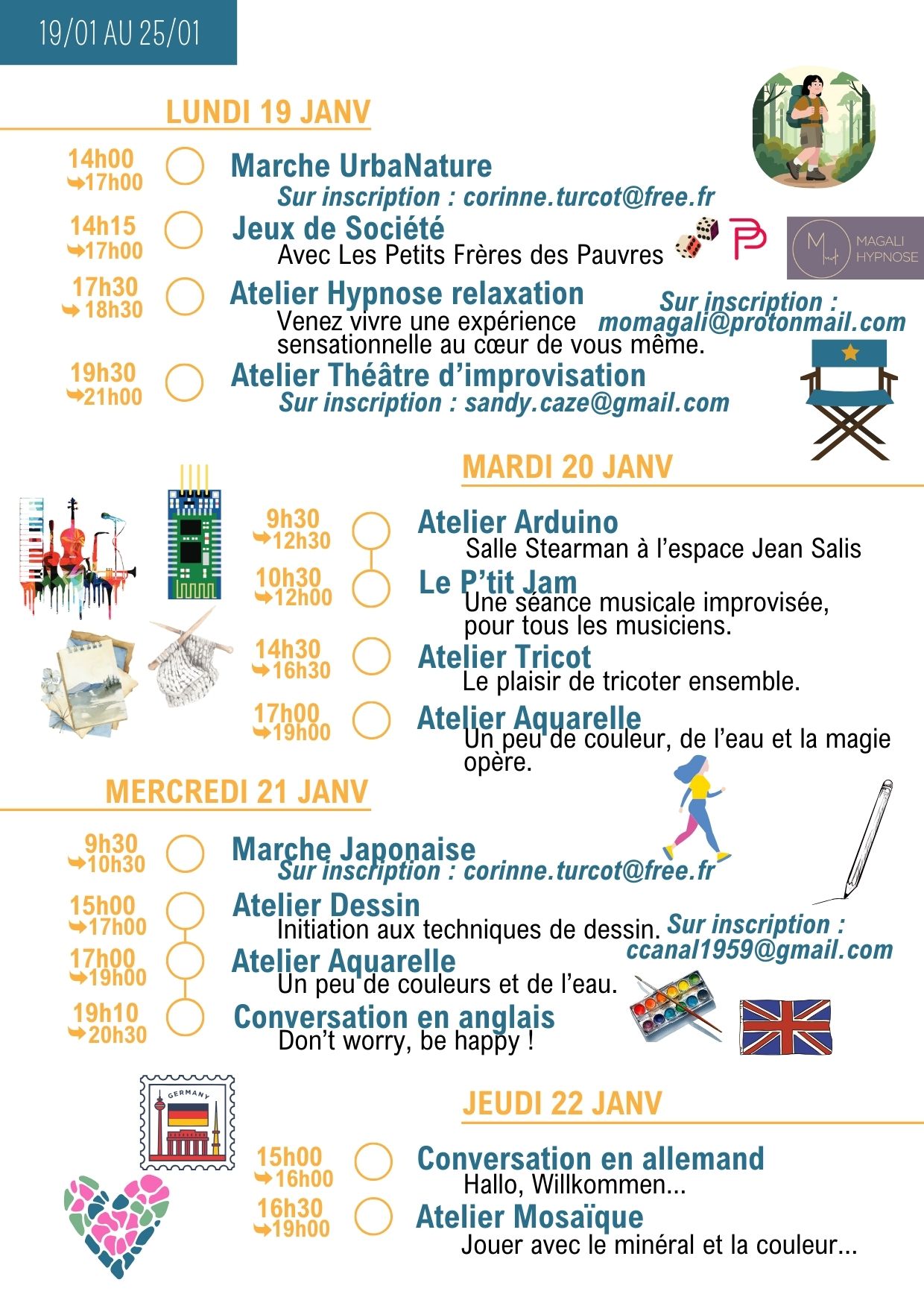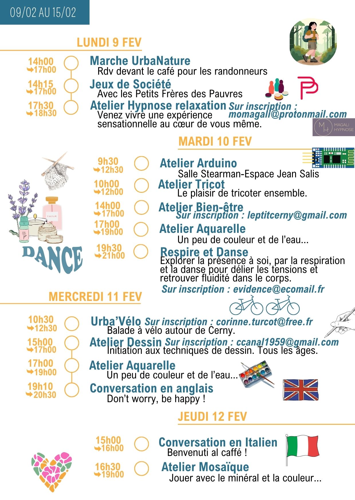 Merci de vérifier les informations dans la lettre hebdo, les jours et les horaires peuvent changer…